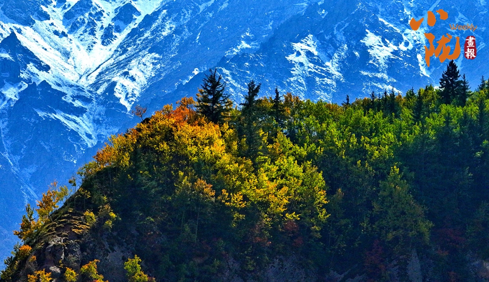 秋風(fēng)吹過,祁連山的原始森林悄然換裝。黃綠交織,紅金點染,仿佛大自然執(zhí)筆揮灑的油畫,靜謐而熱烈。尤其是在陽光的照耀下,與遠(yuǎn)處的雪山和湛藍(lán)的天空、潔白的云朵,形成鮮明的對比。