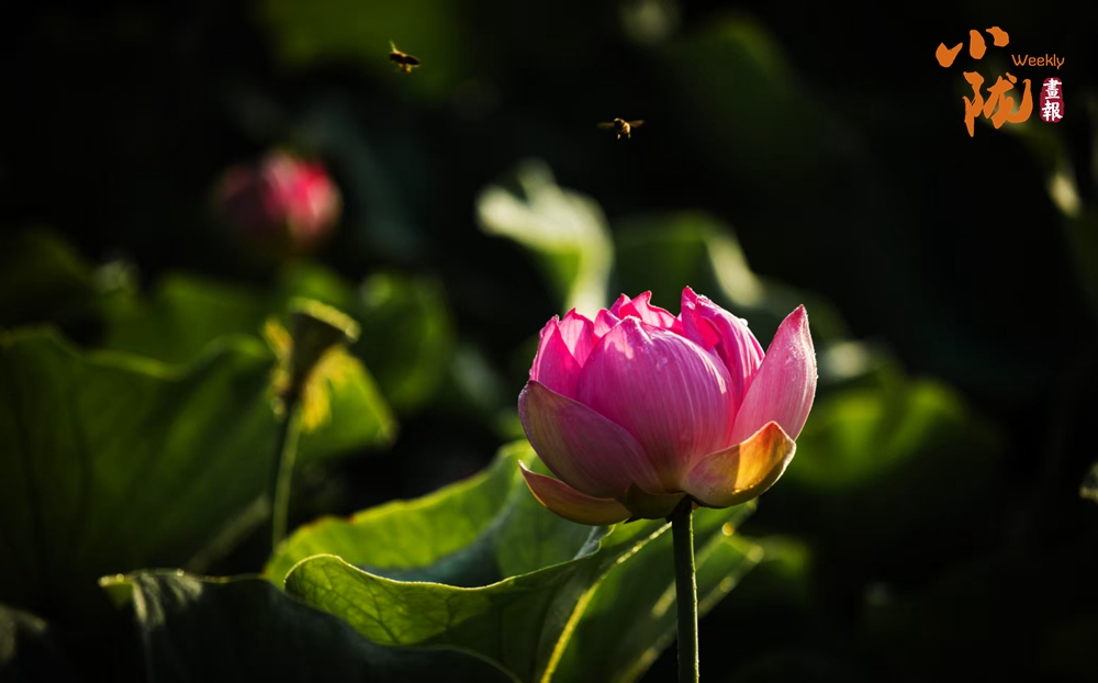 荷花成片盛開,偶有蜜蜂飛來飛去,時而駐足在花苞尖上,時而又快速飛向另一朵荷花,構(gòu)成了一幅靈動的“蜜蜂戲荷圖”。水中的魚兒也不甘寂寞,穿梭在荷葉間,偶爾躍出水面,濺起朵朵水花,為這靜謐的荷塘增添了幾分生機(jī)。