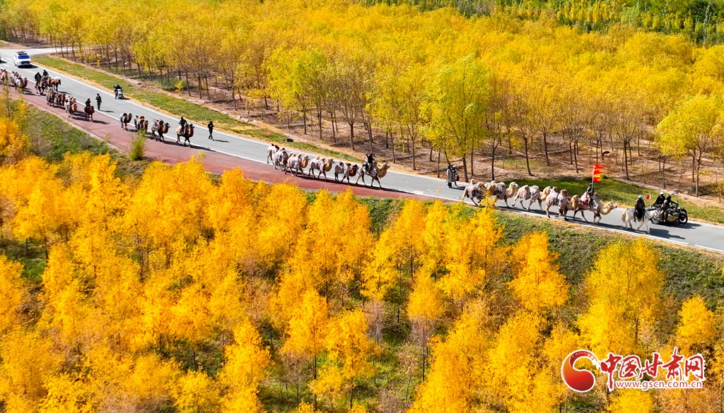 金秋十月,張掖市甘州區(qū)黑河林場(chǎng)萬(wàn)畝胡楊林迎來(lái)流金季節(jié)。10月15日,一支駝隊(duì)行進(jìn)其間,領(lǐng)略這最美的時(shí)光。這片昔日亂石林立、滿目瘡痍的黑河亂石灘,如今已成為6萬(wàn)畝的城市森林,游人、駝隊(duì)行進(jìn)其中,與金色林海共同構(gòu)成了一幅動(dòng)人的生態(tài)畫卷。