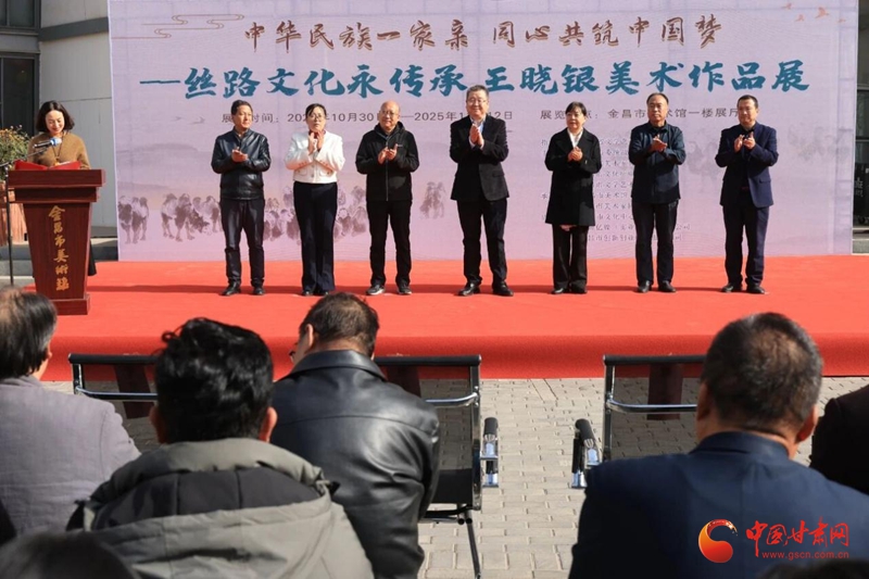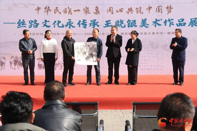 中國甘肅網(wǎng)10月31日訊 (文/趙琴 圖/柯玉棟)秋去留金彩,冬臨賞丹青。10月30日,由甘肅省文學(xué)藝術(shù)界聯(lián)合會(huì)指導(dǎo),金昌市委統(tǒng)戰(zhàn)部、甘肅省美術(shù)家協(xié)會(huì)、金昌市文化廣電和旅游局、金昌市文學(xué)藝術(shù)界聯(lián)合會(huì)主辦,金昌市美術(shù)館、金昌市美術(shù)家協(xié)會(huì)承辦,金昌市文化中心、甘肅億鎳(實(shí)業(yè))集團(tuán)有限公司、金昌市創(chuàng)新創(chuàng)業(yè)孵化服務(wù)中心協(xié)辦的“中華民族一家親 同心共筑中國夢(mèng)”——絲路文化永傳承 王曉銀美術(shù)作品展在金昌市美術(shù)館開展。
