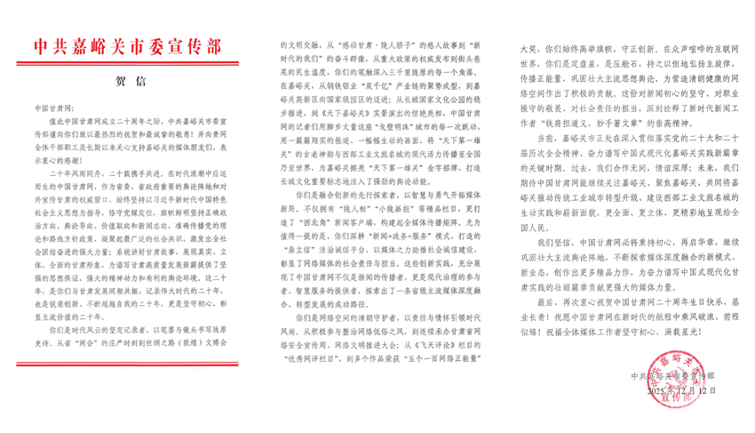 中國甘肅網(wǎng)12月12日訊(西北角·中國甘肅網(wǎng)記者 宋芳科)值中國甘肅網(wǎng)成立二十周年之際,中共嘉峪關(guān)市委宣傳部特向中國甘肅網(wǎng)發(fā)出賀函,致以最熱烈的祝賀與最誠摯的敬意,高度肯定二十年來中國甘肅網(wǎng)為嘉峪關(guān)新聞宣傳事業(yè)、輿論引導(dǎo)工作作出的重要貢獻,并對長期以來的支持表示衷心感謝。