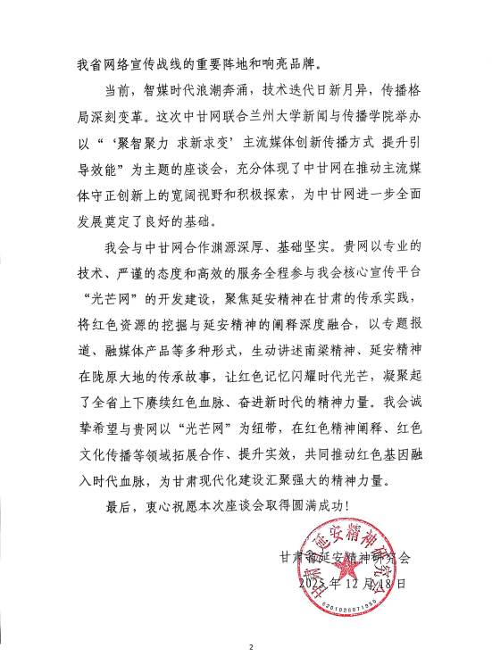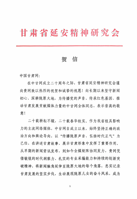 中國(guó)甘肅網(wǎng)12月22日訊(西北角·中國(guó)甘肅網(wǎng)記者 劉姍)值中國(guó)甘肅網(wǎng)成立二十周年之際,甘肅省延安精神研究會(huì)向中國(guó)甘肅網(wǎng)發(fā)來(lái)賀函,致以熱烈祝賀與誠(chéng)摯祝愿。