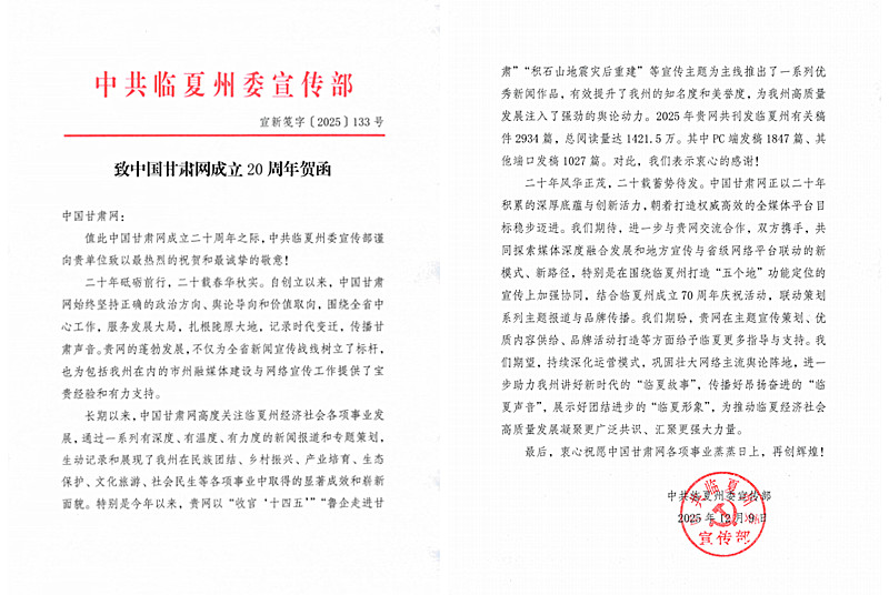賀函稱贊,歷經(jīng)二十年發(fā)展,中國甘肅網(wǎng)風華正茂、蓄勢待發(fā)。憑借深厚底蘊與創(chuàng)新活力,正朝著打造權威高效全媒體平臺的目標穩(wěn)步邁進。