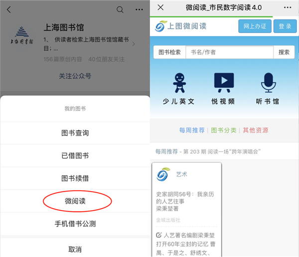 凡是擁有上海圖書館讀者證的讀者,即可登錄上海圖書館提供遠(yuǎn)程服務(wù)的數(shù)據(jù)庫,或者已經(jīng)開通的虛擬讀者證也可以訪問“微閱讀”電子資源。關(guān)注上海圖書館公眾號后,通過微信菜單:“我的圖書”——“微閱讀”。