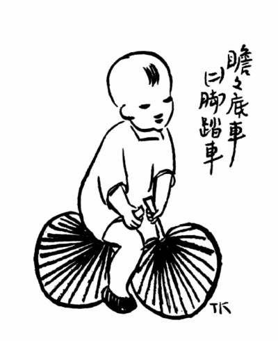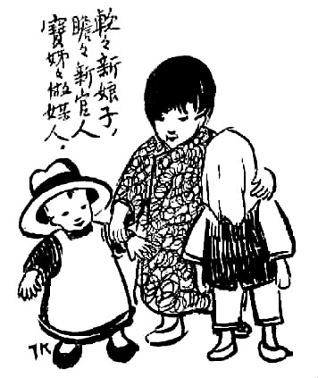 子愷先生藝術(shù)之獨特在另一方面——獨樹高標,表現(xiàn)童心童趣,抒情融入詼諧,展示了一種美學(xué)境界。此類經(jīng)典之作大多收集于《兒童相》。令人過目不忘者如畫孩子持兩蒲扇,一前一后,作騎馬狀,題曰“瞻瞻的腳踏車”;孩子將自己的鞋子墊于四腳圓凳之下,題曰“阿寶兩只腳,凳子四只腳”。于兒童經(jīng)驗之局限寫其心靈之天真,于不起眼的、平常人視之無所謂的現(xiàn)象中發(fā)現(xiàn)童心之美。還有一幅令人印象深刻,三個孩子,一女稍高,立于中,左側(cè)男孩,戴英式禮帽,甚大,右側(cè)女孩,頭蒙面布,題曰“軟軟新娘子,瞻瞻新官人,寶姊姊做媒人”。其事極不現(xiàn)實而孩子極慎重,于兒童顯示童心童趣,于畫則表現(xiàn)了先生的愛心和幽默。
