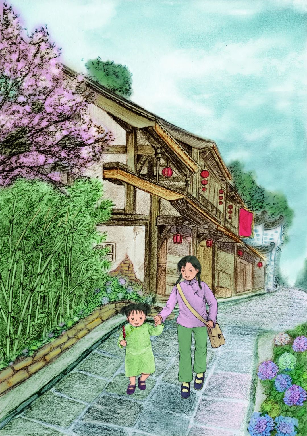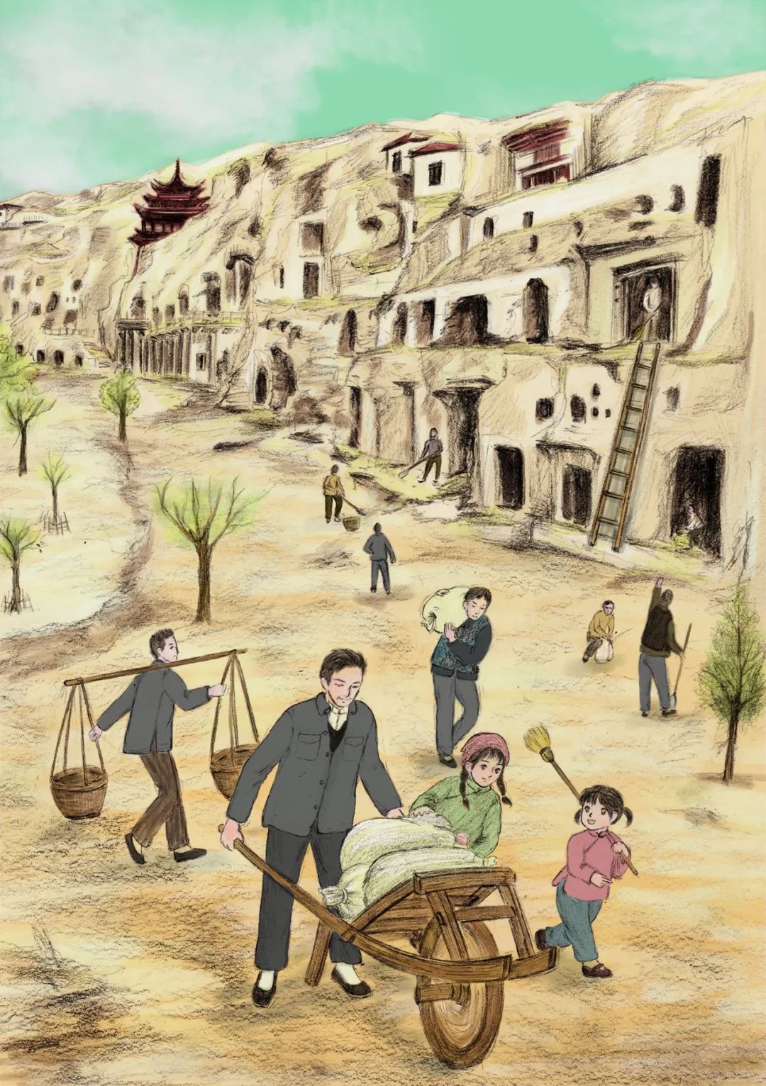 《敦煌小畫師》的故事,以民國時(shí)候國立敦煌研究所初創(chuàng)時(shí)期為背景,以一個(gè)小女孩欣潔的眼光,摹刻了一群以敦煌為文化藝術(shù)圣地而奮斗而獻(xiàn)身的藝術(shù)家和學(xué)者群體,這個(gè)群體以欣潔的父親為代表,他們舍棄溫暖濕潤的家鄉(xiāng),而遠(yuǎn)赴那個(gè)遙遠(yuǎn)荒涼的所在。因?yàn)槟抢镉卸鼗停驗(yàn)槟抢锉4嬷磺Ф嗄昵暗恼滟F文物和彩塑壁畫,還因?yàn)槟抢锛毙栌腥藖肀Wo(hù)、修復(fù)和弘揚(yáng)。他們來了,他們在這片戈壁之地安家扎根,在動(dòng)蕩的社會(huì)時(shí)局下開始了為家為國的擔(dān)當(dāng),也開始了人生理想和價(jià)值的實(shí)現(xiàn)。這一切,以一個(gè)孩子的眼光來看,幾乎就是交織著欣喜和失望、歡喜與憂愁,從茫然無知到誠摯熱愛的一段生動(dòng)故事?!抖鼗托‘嫀煛饭适虑楣?jié)的設(shè)定,有起伏有高潮,有親情之愛,有田野之趣,更有人與人之間和諧相助的人性之美,讀起來有聽一首鄉(xiāng)村音樂的韻律感。我覺得,一部優(yōu)秀的兒童文學(xué)作品,應(yīng)該就是這個(gè)樣子。