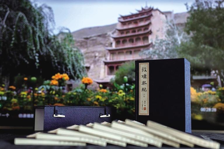 兩個(gè)月后,我如愿以償?!抖鼗捅炯o(jì)》繁體線裝本(限量版)出品,兩函,每函八冊(cè),總計(jì)十六冊(cè),繁體豎排,全手工裝訂。技藝之美,工序之繁,裝幀之考究,未之見過!當(dāng)我打開拿到手上時(shí)肅然起敬,自然會(huì)靜下來(lái),恭恭敬敬翻閱,你能感受到甘肅豐富的歷史文化資源、厚重的文化積淀和波瀾壯闊的滄桑巨變。正是偉大的藝術(shù)和同樣偉大的宗教,在敦煌建筑了人類精神的輝煌莫高窟,人們生活在其中,才擁有現(xiàn)實(shí)人生意義的充實(shí)感和踏實(shí)感。