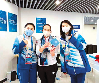 來自北京語言大學(xué)的志愿者向國際奧委會官員(中)贈送《冬奧會交際漢語口袋書》。
