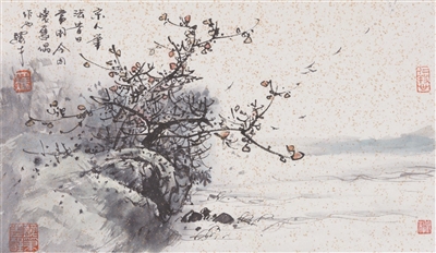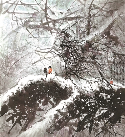 馮先生還和夫人在每年結婚紀念日時一起作畫,“我們?nèi)ツ赀^了綠寶石婚,結婚55周年。每到結婚紀念日,都是我們倆人畫一幅,畫一對小鳥。早在六七十年代最艱苦的時候就開始了,因為我夫人也是畫畫的,我們那時一起畫了一對小鳥在風雪里,那幅畫我現(xiàn)在還有。后來我們一直畫鳥,風景在不斷地變化,這和我們對生活的感受有很大的關系。”