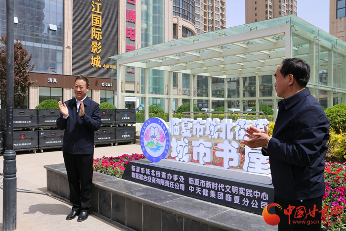 甘肅省委宣傳部副部長、省新聞出版局(版權(quán)局)局長王成勇(左)為臨夏市城北街道城市書屋揭牌
