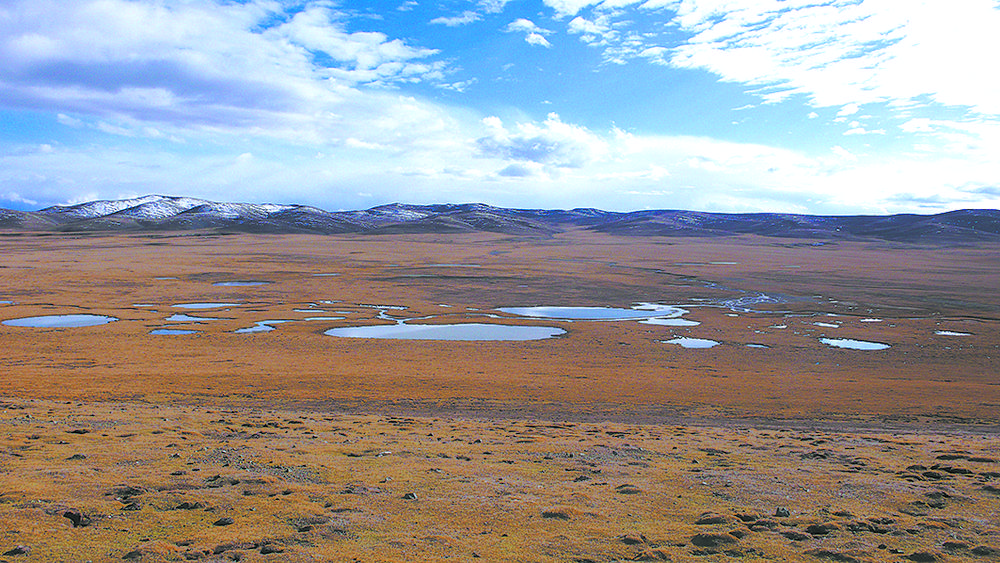 約古宗列位于青藏高原東北部,海拔高度在4200米~4800米,地勢西北高,東南低。站在腳下小泉邊,抬眼先看到的是西面距我們最近的雅合拉達(dá)合澤山,它是1952 年新中國第一個河源查勘隊(duì)曾認(rèn)定的黃河源頭山。南望,遠(yuǎn)處最高的雪峰,是長江黃河的分水嶺巴顏喀拉山;視線左移,東方藍(lán)天白云下,同樣白雪皚皚的是阿尼瑪卿山。以約古列宗為中心輻射,在這東西長約220 公里,南北最大寬150 公里的高山草甸帶與高山草原帶的過渡地帶,東面阿尼瑪卿山阻擋了東南暖濕氣團(tuán)西進(jìn),南面巴顏喀拉山又削弱了溯谷地北進(jìn)的西南季風(fēng)勢頭,再加之北面布爾漢布山的屏障作用,把源區(qū)與干旱的荒漠地區(qū)隔開,使這里年平均氣溫在-4℃左右。青藏高原半濕潤地區(qū)氣候和遠(yuǎn)處雪山冰川的不斷融化,使母親河上源的兩眼泉和其他那些數(shù)不清的泉,源流不斷,經(jīng)年汩汩。