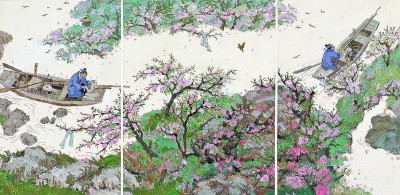 “芳草鮮美,落英繽紛。漁人甚異之,復(fù)前行,欲窮其林。”蔡皋輕聲道,“異”就是驚奇,正因有了好奇,才讓漁人鼓足勇氣,探尋奇境。“我傾注筆墨,來描繪漁人發(fā)現(xiàn)桃花源的整個(gè)過程。”