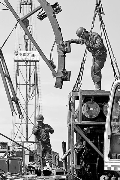 在位于克拉瑪依的新疆油田公司百口泉采油廠瑪湖第一采油作業(yè)區(qū),石油工人正在進(jìn)行測試作業(yè)。閔勇攝/光明圖片