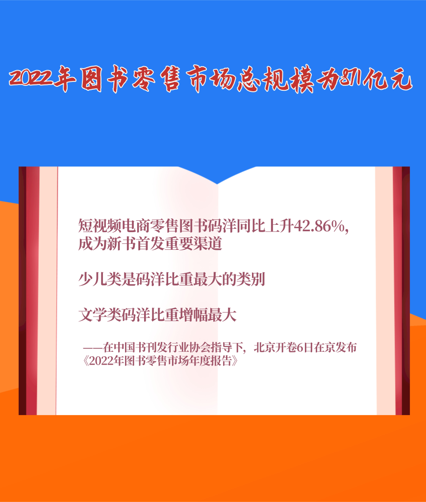 1月6日,在中國書刊發(fā)行業(yè)協(xié)會指導下,北京開卷信息技術有限公司在京發(fā)布《2022年圖書零售市場年度報告》。報告顯示,2022年我國圖書零售市場碼洋規(guī)模為871億元。短視頻電商零售圖書碼洋同比上升42.86%,碼洋占比趕超實體書店,成為新書首發(fā)重要渠道。