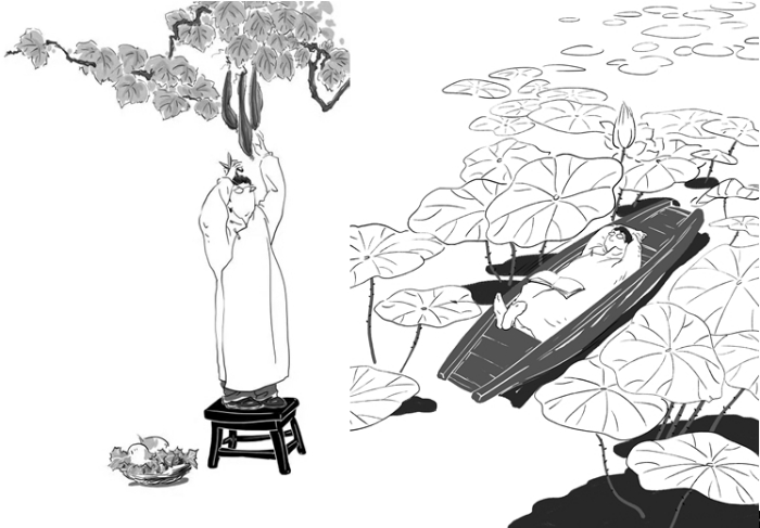 綠葉扶紅花,雅閣、秋雨為這本書的配圖也頗有特色。隨筆《理想與鄉(xiāng)愁》的封面,是一位戴著眼鏡、長相酷似作者的文人站在小凳子上,準(zhǔn)備將掛在枝頭的絲瓜摘下來以供午餐之需,腳旁一只狗狗看守著筐子里的兩個(gè)大水蘿卜。這幅圖與左面的書名遙相呼應(yīng):作者的“理想”與“鄉(xiāng)愁”就在絲瓜藤下結(jié)為了一體。詩集《人生歸處是田園》的封面是三株樹下,那位戴眼鏡的文人坐在長椅上,望著右面空椅子上的三只小鳥,一付若有所思的樣子;而葉廷芳為詩集所寫序言文末的尾花,還是這幅圖,只不過沿縱軸轉(zhuǎn)動(dòng)180°——文人從右面望向左面。一里一外兩幅畫互為鏡像,似乎是暗示人們,藝術(shù)就是社會(huì)生活既真實(shí)又不完全一樣的反映。