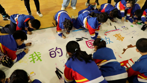 學(xué)生在繪本進(jìn)校園活動(dòng)中手繪畫(huà)布“我的中國(guó)故事”