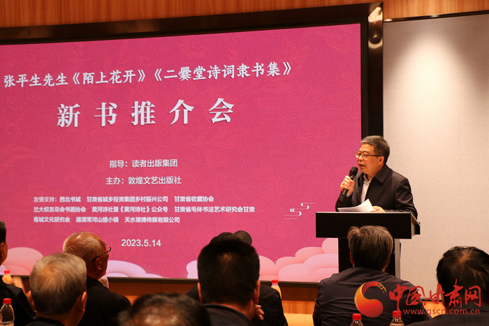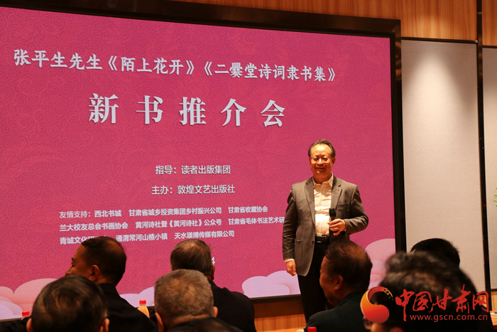 中國甘肅網(wǎng)5月14日訊 (本網(wǎng)記者 張?zhí)m琴)被稱為中國文字演變“活化石”的爨(cuàn)體字,作為中國古代稀有字體和在中國書法藝術(shù)中的特殊地位而備受推崇。甘肅本土詩人、書法名家張平生最新創(chuàng)作的《陌上花開——二爨堂吟稿》和《二爨堂詩詞隸書集》以活化了“二爨”在當代的創(chuàng)作形態(tài)著稱,于14日上午在蘭州西北書城舉行的新書推介會上,被眾多文化藝術(shù)名家予以高度贊譽。