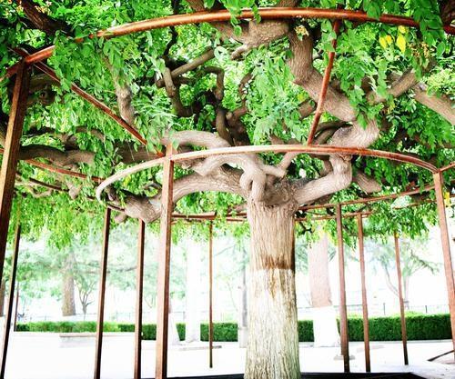 博物館里的這兩棵龍爪槐分別種植在展覽大樓前的東西兩角,是博物館的老專家郭維屏先生所種植。1959年秋冬,甘肅省博物館從通渭路舊館搬遷到七里河的新館,新館內(nèi)一片荒涼,亟待綠化。而就在此時,郭維屏老先生調(diào)入博物館工作,參與到館內(nèi)的綠植規(guī)劃建設,也正好發(fā)揮自己的藝術(shù)特長。這兩棵龍爪槐的幼株是郭老先生從五泉山苗圃選購的,栽種到展覽大樓前院的東西兩角,槐樹的周圍還設計了幾個形狀不一的花壇,花壇內(nèi)種植了各色各樣的樹木,一眼望去郁郁蔥蔥,生機盎然,頗有些韻味。這兩棵龍爪槐剛栽種時體型嬌小,看起來很不起眼。經(jīng)過郭老先生和博物館幾代人的悉心栽培,如今已是樹冠優(yōu)美,花香四溢。每到槐花盛開的時候,滿庭飄香,沁人心扉,成了博物館里一道靚麗的景色,引得路人駐足欣賞。東角的龍爪槐高約2米,樹干粗達2尺多,樹冠如傘,頂端長出八、九個主枝向四面伸展,屈曲盤繞,而后又分為數(shù)十個中枝和數(shù)百個小枝,互相攀援,屈折如爪,一枝獨秀。而西角的龍爪槐因基建的原因長勢受到一定影響。