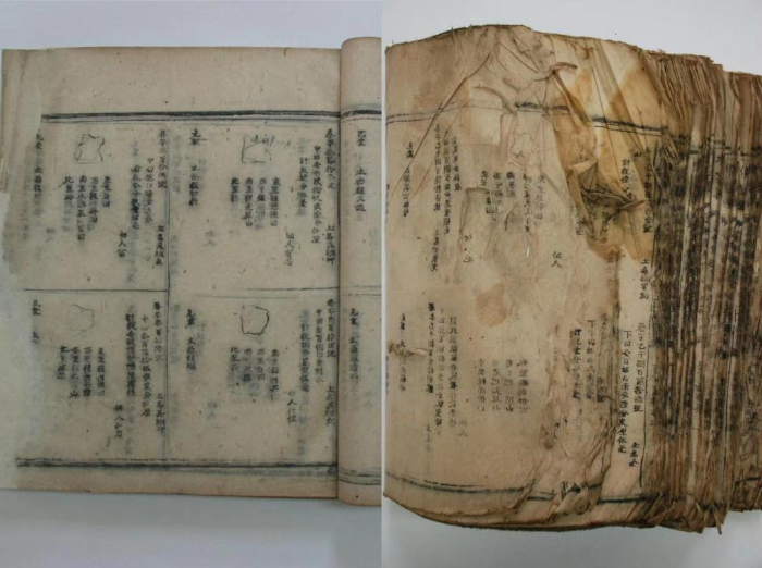 2021年,安徽省圖書館修復(fù)的徽州休寧《魚鱗圖冊(cè)》(明萬歷木活字印本)修復(fù)前后對(duì)比圖。(安徽省圖書館供圖)