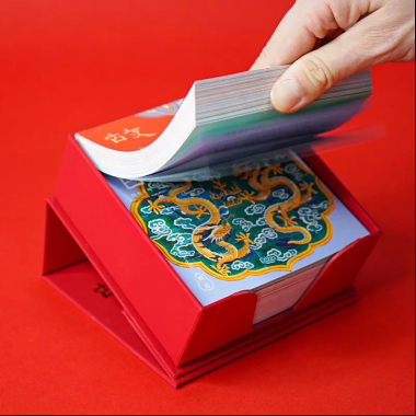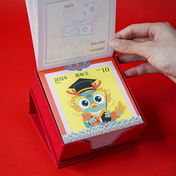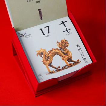 如意取出第一層里紅紅的燙金書刊盒,馬上發(fā)現(xiàn)了它的小機(jī)關(guān):原來盒蓋上有個(gè)吸鐵石,把它翻過來,就可以25度傾斜地放在書桌上,舒服地翻閱一整年的“日子”;每一天的頁(yè)面都能被絲滑地撕下,作為小書簽,插在課本讀物中。