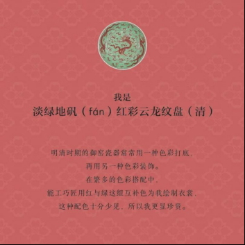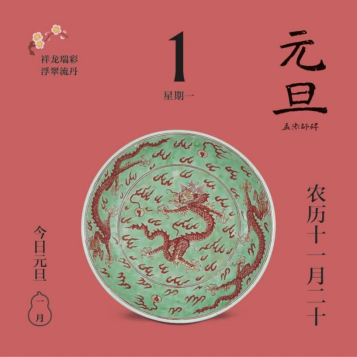 翻開新年伊始的“元旦”頁(yè),映入眼簾的是一個(gè)綠色的盤子,上面有三條雄勁矯健的“龍爺爺”,它們來自清代吧!如意輕輕撕下日歷頁(yè)翻到反面,讀起文物小故事:“我是淡綠地礬(fán)紅彩云龍紋盤……”