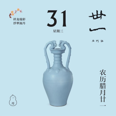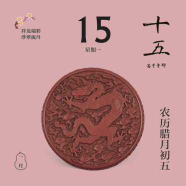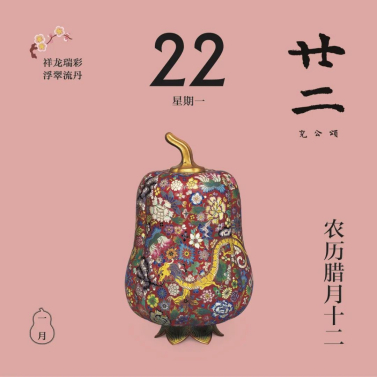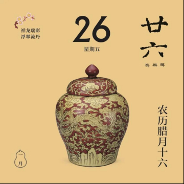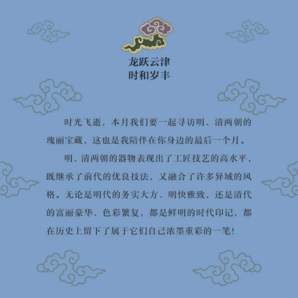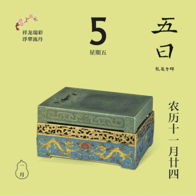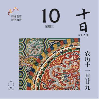 翻開1月月份頁(yè),首先跳入眼簾的,是主題詞“祥龍瑞彩”。這個(gè)月以絢麗的顏色為主線,串起各色龍文物,比如精致的宋代單色釉龍紋盤,絢麗的故宮官式建筑和璽彩畫,還有優(yōu)雅的清代掐絲琺瑯游龍花卉紋瓜式蓋罐……