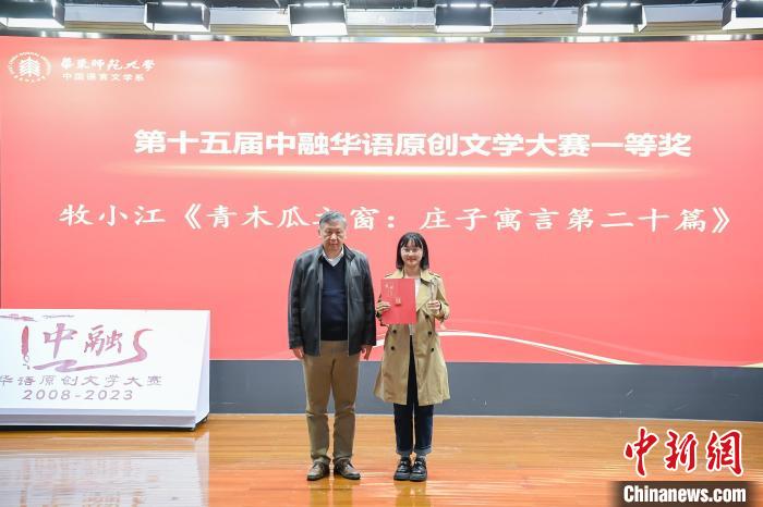 第十五屆中融華語原創(chuàng)文學(xué)大賽一等獎(jiǎng)獲得者朱禹同(筆名牧小江)從孫甘露手中接過獎(jiǎng)狀、獎(jiǎng)杯。(華東師范大學(xué)供圖)