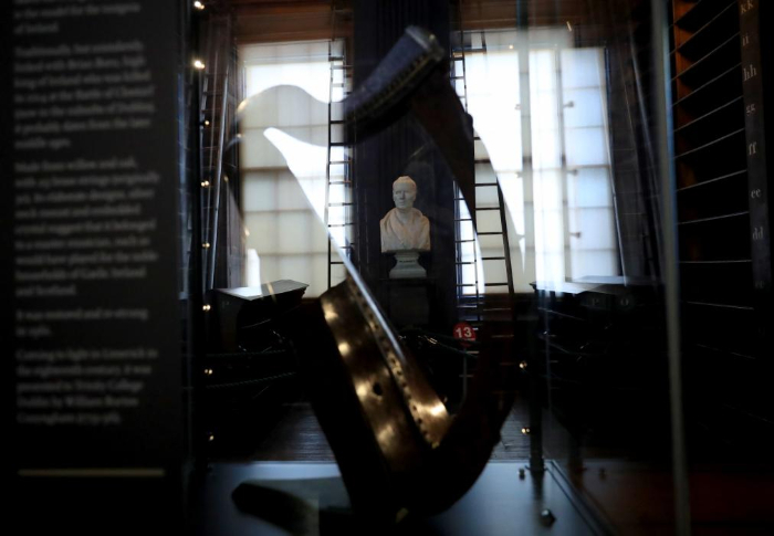 這是在愛爾蘭都柏林大學(xué)圣三一學(xué)院老圖書館拍攝的豎琴和雕像(1月16日攝)。