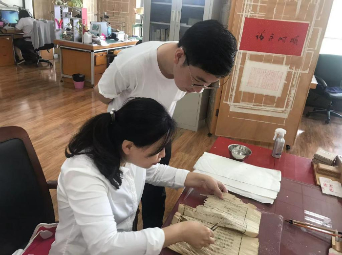 “古籍修復(fù)容不得任何失誤。每一道工序都要小心翼翼、屏息凝神。”王斌說,每拿到一本古籍,修復(fù)師首先要查看并記錄破損情況,同時(shí)制定修復(fù)方案,再根據(jù)方案對(duì)古籍進(jìn)行清洗、配紙、修補(bǔ)、錘平、修剪、壓實(shí)、裝訂……整個(gè)過程前后有幾十道繁瑣工序。