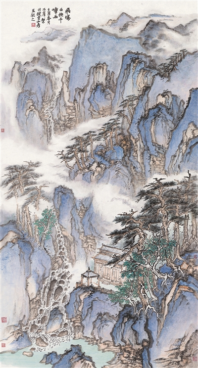 繼承傳統(tǒng),汲古出新,通過(guò)表現(xiàn)山河景象、園林景致、田園風(fēng)光等,營(yíng)構(gòu)沉靜清雅的審美意境,是當(dāng)代青綠山水畫創(chuàng)新趨勢(shì)之一。有的創(chuàng)作者重在彰顯新時(shí)代山水精神。像高云為江蘇大劇院創(chuàng)作的巨幅青綠山水畫《江山如此多嬌》,取景視角借鑒傅抱石、關(guān)山月的同名畫作,意境遼遠(yuǎn)開(kāi)闊,又創(chuàng)新構(gòu)圖、表達(dá)形式,在工寫結(jié)合中描繪了江蘇地域風(fēng)光。如石峰作品《飛瀑正拖千嶂雨》,用色雅正,在與筆墨節(jié)奏的呼應(yīng)中強(qiáng)化了色彩本身的寫意性。他們筆下的山水,既是自然之景,也是畫家胸中孕育的理想詩(shī)境,讓傳統(tǒng)山水生發(fā)新意蘊(yùn)。有的創(chuàng)作者積極探索色彩美學(xué)與文化意象的巧妙對(duì)接。比如“青綠調(diào)成見(jiàn)天工——山水畫色彩研究展”展出的楊峻《猴王》,內(nèi)容取材自文學(xué)經(jīng)典《西游記》,畫面主體“一巖二松”又借鑒元代畫家唐棣作品,并融入現(xiàn)代審美趣味,實(shí)現(xiàn)了青綠文化內(nèi)涵與文學(xué)意象輝映。這些作品從不同角度拓展青綠山水畫的表現(xiàn)形式,賦予其新的時(shí)代內(nèi)涵。