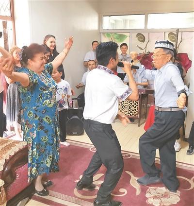 王蒙(右一)與新疆少數(shù)民族群眾一起跳舞。