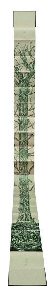 除了材料語言的拓展,展覽中的許多作品還展現(xiàn)出設(shè)計(jì)形式的創(chuàng)新與突破。如陳潔瑩的《蟬鳴樹語》聚焦了蟬絢爛而短暫的生命軌跡。書籍的裝幀方式采用經(jīng)折裝,當(dāng)書本徐徐展開,一棵參天古樹好似拔地而起,貫通全書首尾。由樹根處為起點(diǎn)向上閱讀直至樹冠,可見蟬從卵枝到若蟲,再經(jīng)歷脫殼變?yōu)槌上x的歷程。經(jīng)由巧妙的形式設(shè)計(jì),生命的輪回在書頁間流轉(zhuǎn),詮釋出動人的自然之力。