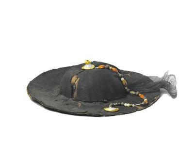 這一頂鑲寶石鈸笠帽,可要豪華貴重得多,這是一頂帽頂垂有一串玉石珠串飾的帽子,帽的直徑有35厘米。《大元典章》曾記載有人搶走蔡國(guó)祥懸有紅瑪瑙珠串的棕帽的事。可見帽上垂串飾也是元代貴族的風(fēng)氣。這種帽子的流行始于元成宗大德年間(1297—1307),一個(gè)商人賣給官府一塊紅剌子(紅寶石)重一兩三錢,用于鑲嵌帽頂。從此以后,歷代皇帝相承。凡元旦及天壽節(jié)大朝賀時(shí)都戴這種鈸笠帽。漳縣元代汪世顯墓出土的這頂鈸笠帽,帽頂鑲金裹玉,由帽頂垂系31顆珠玉組成的串練。以珠玉寶石來裝飾帽子,帽子的價(jià)值之高昂自不待言。