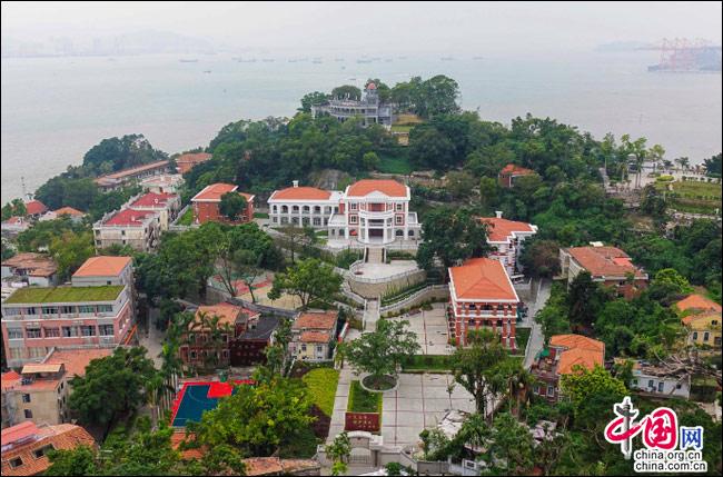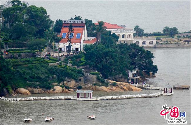 如果有這樣一座島嶼——遠(yuǎn)處是一方寧靜的藍(lán)天,近處是一片幽深的綠樹,藍(lán)與綠之間,是逶迤而去的清水紅磚……極目遠(yuǎn)眺,只見她濃淡相宜、遠(yuǎn)近相安,仿佛一幅肅穆祥和的印象派油畫;細(xì)細(xì)聆聽,似乎還有一支悠揚(yáng)的鋼琴曲,在伴隨海鷗與濤聲,不時(shí)從畫中飄來……
