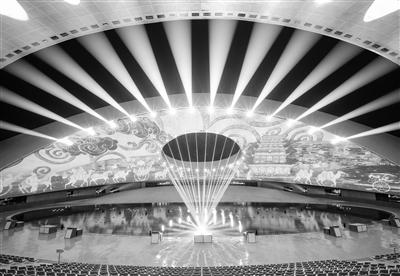 華夏文化展示中心分為展演區(qū)與展示區(qū)兩個(gè)部分,展示區(qū)為古鎮(zhèn)式商業(yè)街,目前已進(jìn)入收尾階段,展演區(qū)為大型激光水舞秀劇場——日月館,去年已試運(yùn)營,效果極佳。別名“黃河巨蛋”的日月館總用地面積為12000平方米,場館外形呈半橢圓形,由兩片獨(dú)立的頂棚覆蓋,場館高30米,寬約80米,內(nèi)設(shè)觀眾席位1450座。場館屋頂?shù)奶煅坶_口和場館地面體現(xiàn)了中國天圓地方的理念以及太陽和月亮的互相映襯。外立面采用了與當(dāng)?shù)貍鹘y(tǒng)屋頂瓦片相呼應(yīng)的獨(dú)特形狀,又像鳥兒折疊的翅膀和羽毛,極富活力和寓意。
