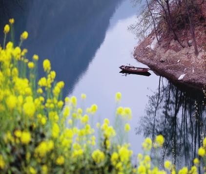 近日,讓水河迎來一年中最美的季節(jié)。逶迤的青山、彎曲的河道,被大片大片盛開的油菜花渲染成一幅春光畫卷。澄碧的江水倒映著近水的村莊和連綿的群山,金黃的油菜花、潔白的櫻桃花、粉紅的桃花相互輝映,偶爾一條小船劃入河中,蕩起層層漣漪……