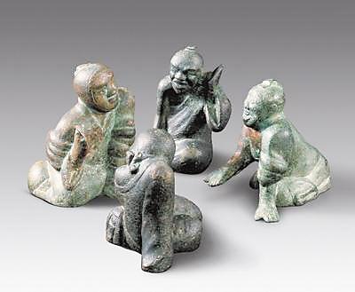20世紀(jì)90年代甘肅靈臺(tái)縣出土了一組西漢銅質(zhì)博戲俑。俑最高9.2厘米,最寬9.7厘米。四俑相向跪坐,身著高領(lǐng)長(zhǎng)服。其中二人頭挽發(fā)髻,二人以寬巾裹頭。坐姿不同,形態(tài)各異,有的前傾仰首,有的垂臂塌肩;有的袒胸露膊,似在伸手探取;有的屈腿斜身,默然扶膝靜坐。四俑的面部表情不同,刻畫細(xì)膩。他們或喜笑顏開,或嚴(yán)肅面對(duì),或凝神沉思,或略顯悲愁,神態(tài)活現(xiàn),精彩逼真,具有高超的藝術(shù)性和研究?jī)r(jià)值。