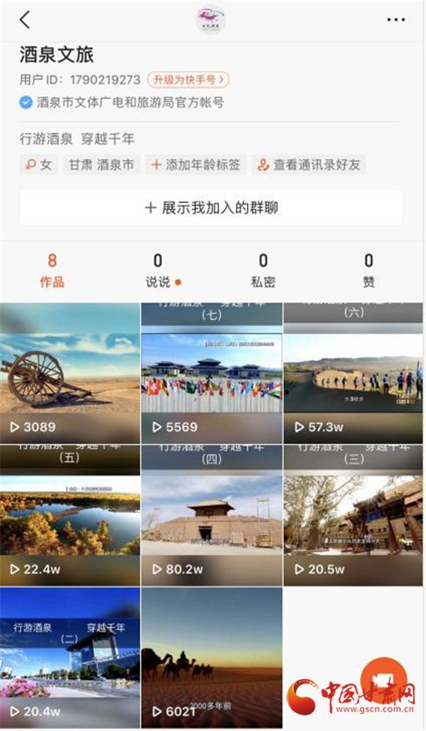 中國甘肅網(wǎng)3月19日訊 (本網(wǎng)記者 張?zhí)m琴)自2月18日甘肅省文旅廳聯(lián)合快手發(fā)起“甘肅文旅快手大V培訓(xùn)計(jì)劃”以來,“酒泉文旅”快手官方賬號(hào)和全市4A級(jí)景區(qū)景點(diǎn)、博物館的導(dǎo)游、講解員連續(xù)發(fā)布了一批有深度、有趣味、有內(nèi)涵的酒泉文旅短視頻,其中“酒泉文旅”快手官方平臺(tái)連續(xù)發(fā)布七期“行游酒泉 穿越千年”酒泉文化旅游形象宣傳短片,截至3月18日,在快手平臺(tái)流量扶持下,“酒泉文旅”快手官方平臺(tái)作品播放量達(dá)202.288萬次、點(diǎn)贊人數(shù)達(dá)55070人,單篇作品最高播放量達(dá)80.2萬次、點(diǎn)贊人數(shù)35193人。