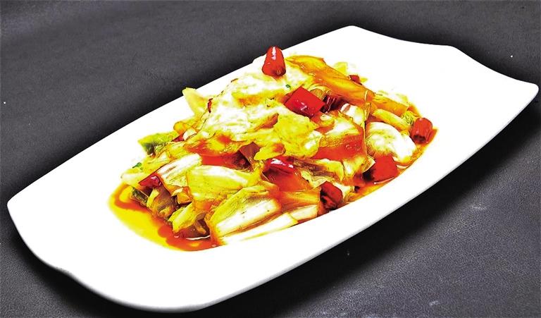 酸辣白菜的食材要選上等的大白菜,剝?nèi)ネ鈱永先~當(dāng)主料。老姜去皮,優(yōu)質(zhì)紅朝天椒泡軟,川椒過(guò)熱水,以白糖、米醋、味精、香油等為輔料。先把白菜切細(xì)條,放入微量鹽,拌勻腌制四五個(gè)小時(shí)后,在涼開水中過(guò)一下,撈出控水,放至微蔫。這時(shí),起炒鍋開火,冷油放入辣椒、花椒、蔥絲、姜絲,慢慢煎至微微發(fā)黃散出香味時(shí),將油潑在白菜上,最后放入白糖、米醋、味精等拌勻,就大功告成了。