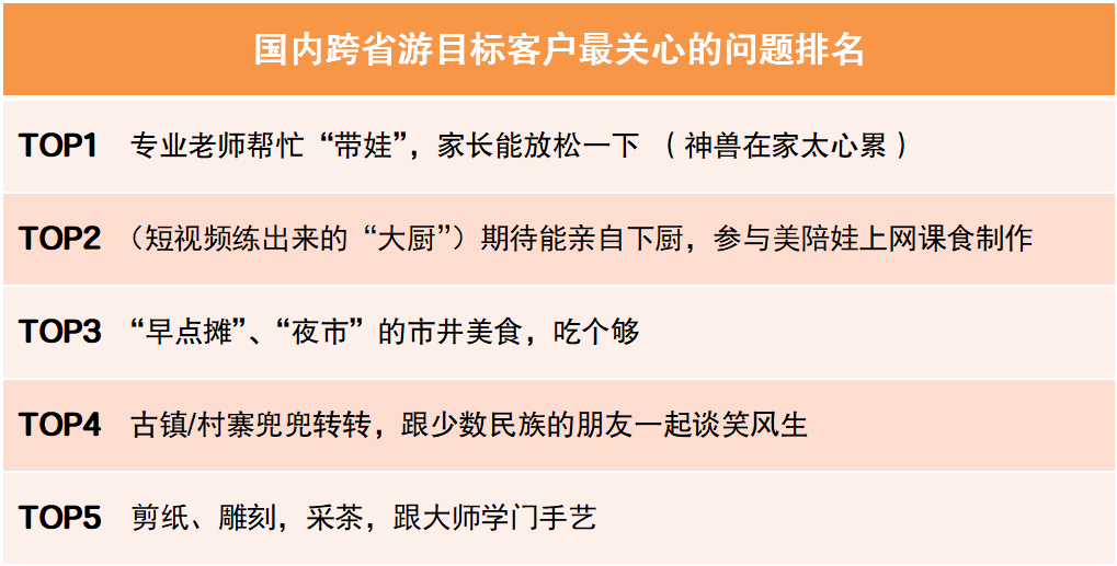 通過(guò)針對(duì)中青旅遨游網(wǎng)會(huì)員、中青旅聯(lián)盟成員單位的忠實(shí)客戶等群體的調(diào)研,以及近半年中青旅遨游網(wǎng)搜索、瀏覽的監(jiān)測(cè)數(shù)據(jù)進(jìn)行綜合分析。結(jié)果顯示,西南和西北是客戶喜好程度最高的兩大地域;云南、江蘇、新疆、三亞、陜西是客戶喜好程度最高的五大熱門目的地。客戶最關(guān)心的問(wèn)題,帶娃、參與、美食、閑逛、學(xué)藝則位列前五名。
