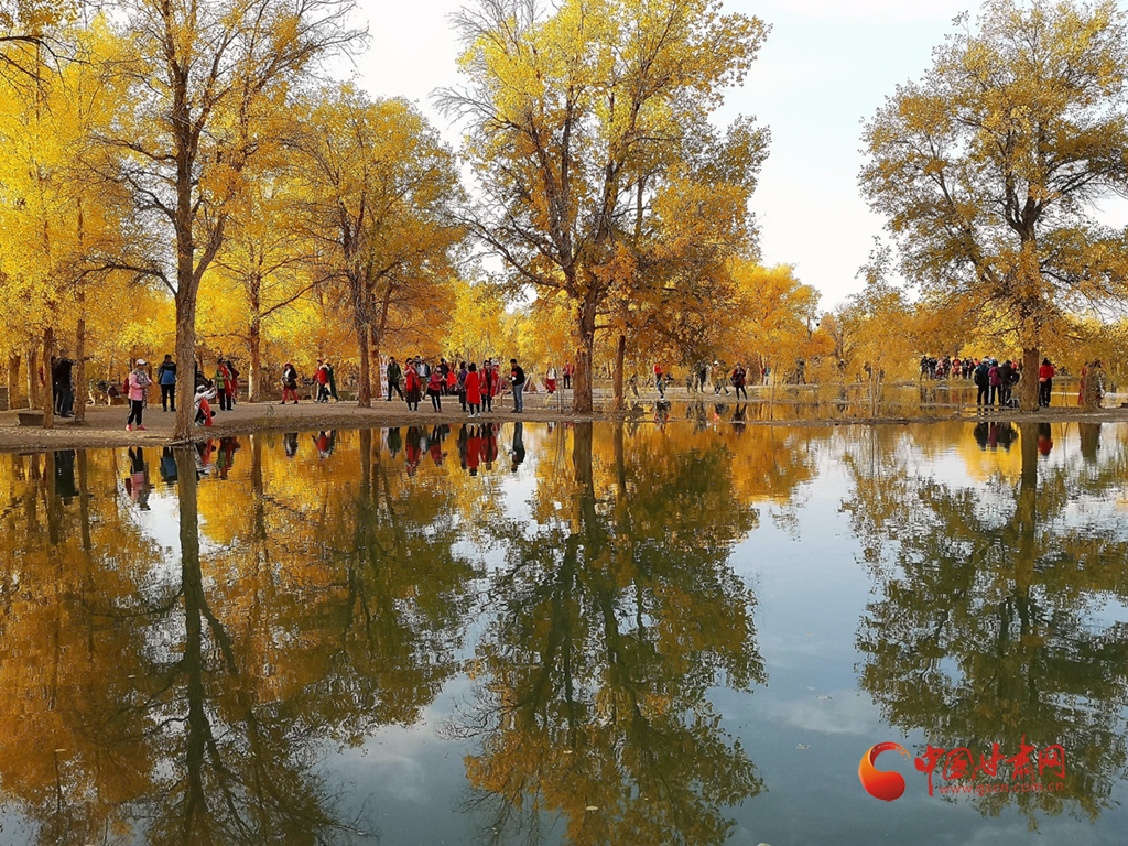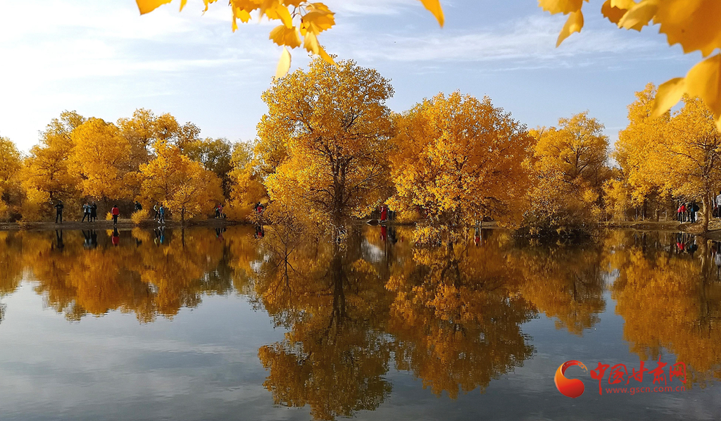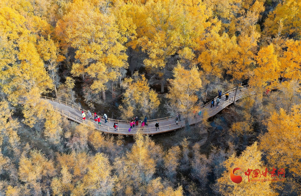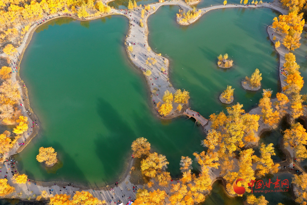 10月10日,在甘肅省酒泉市金塔沙漠胡楊林景區(qū),胡楊林在陽(yáng)光的照耀下金黃燦爛,與湖水相映,令人流連忘返。(無(wú)人機(jī)照片)