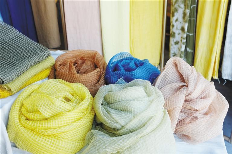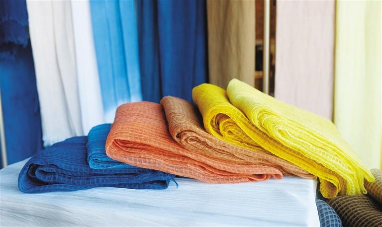 采用棉、毛、絲、麻幾種天然纖維,運用中藥材古法染色技藝制成。使用紅花染、黃檗染、藍靛染等染制出的成品絲巾色澤亮麗,質感舒適,天然無污染。