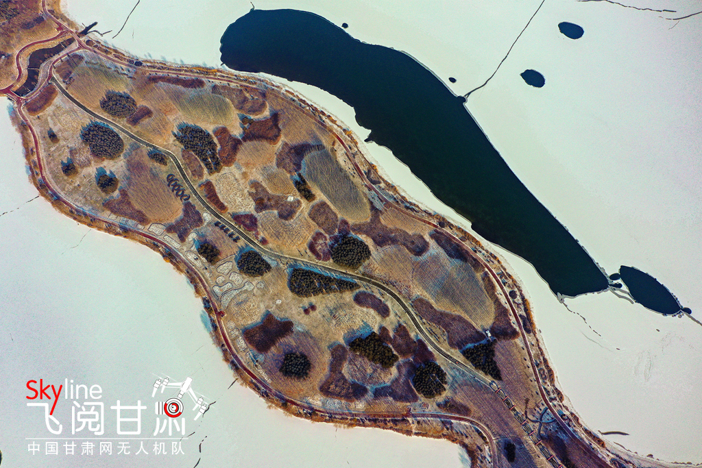 12月2日,雪霽天晴,冰封的黑河和漸凍的蘆水灣湖面上,皚皚白雪與裸露的水面形成丹青畫(huà)卷,別有一番趣味。(無(wú)人機(jī)照片)