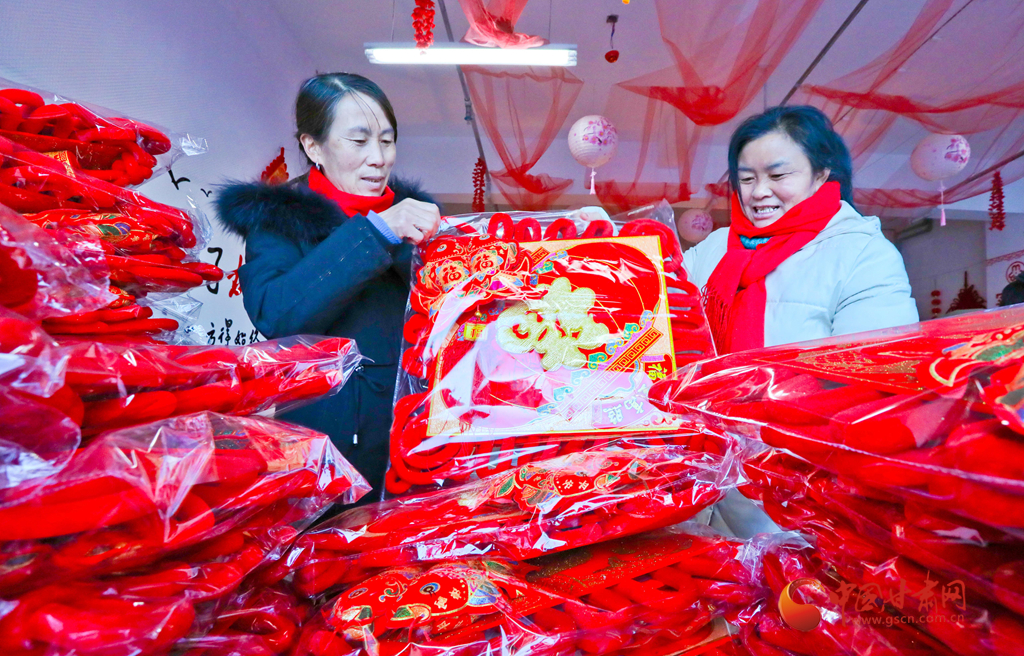 1月6日,甘肅民樂生態(tài)工業(yè)園區(qū)的巾幗扶貧車間內(nèi),女工們?cè)诎b編織好的中國(guó)結(jié)準(zhǔn)備發(fā)運(yùn)。