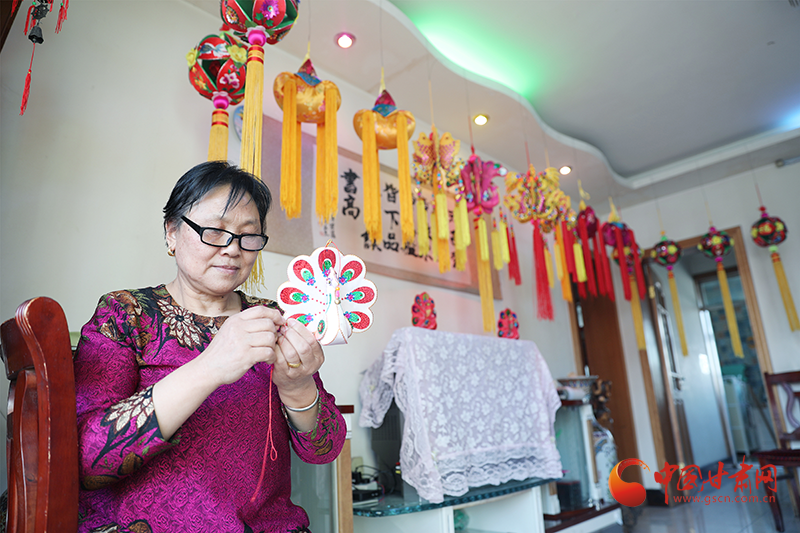 民樂縣宮燈制作代表王秀娥正在繡制孔雀手工藝品