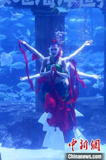 身著綠衣紅褲的飛天舞蹈服、腳穿雙蹼,在5米多深的人造海水中與海洋精靈共舞,在蘭州極地海洋世界,三位“美人魚(yú)”表演“海底飛天”,吸引眾多游客觀看。