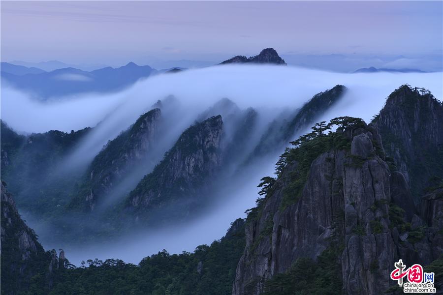5月22日傍晚,雨后安徽黃山風(fēng)景區(qū)現(xiàn)壯觀的云海奇觀,見云海奔騰而來,越過北海的始信峰,沿著群峰傾瀉而下勢如瀑布之壯觀,在奇群、怪石和形態(tài)各異黃山松的作用下勾勒出一幅幅流動的水墨畫;黃山不僅是云霧之鄉(xiāng),更是中國傳統(tǒng)水墨畫的天然的素材。(姚育青)