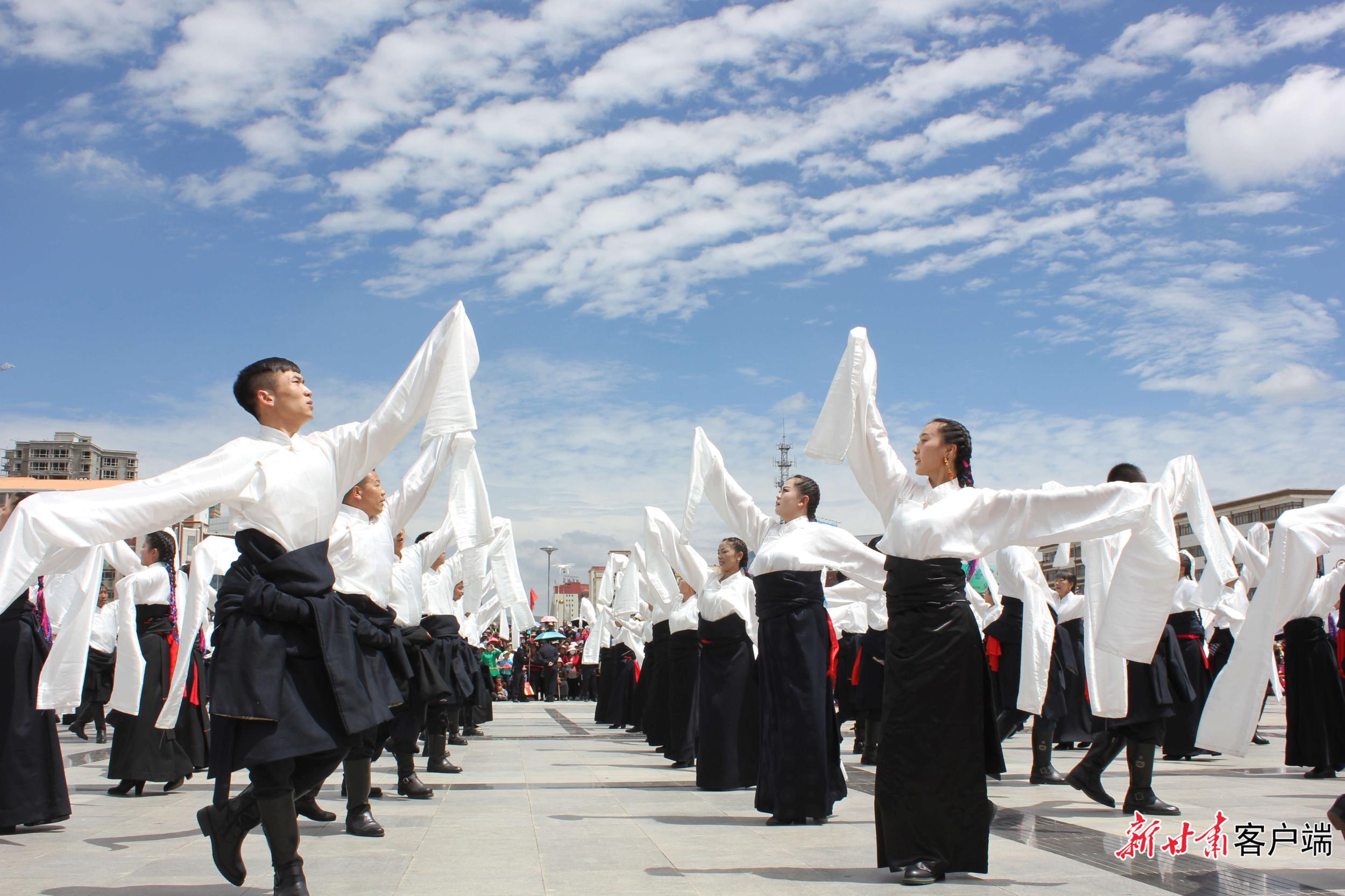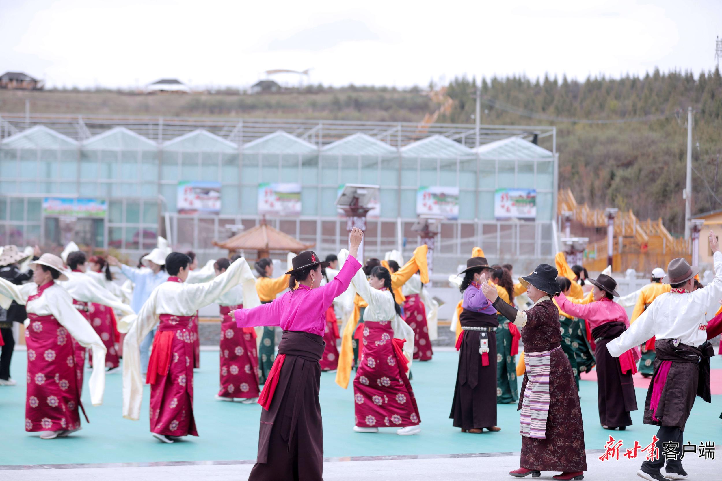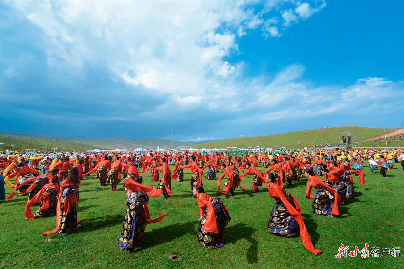 5月29日,在距離合作市區(qū)2公里處的加拉尕瑪村,隨著《吉祥甘南》優(yōu)美的旋律,游客與身著特色民族服裝的藏族兒女,和著優(yōu)美的節(jié)拍跳起了鍋莊舞。動聽的樂曲、颯爽的舞姿、五彩的服裝,讓當(dāng)周草原陷入了一片歡樂的海洋。