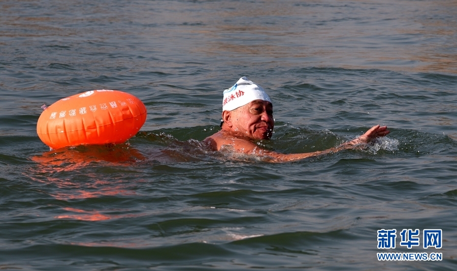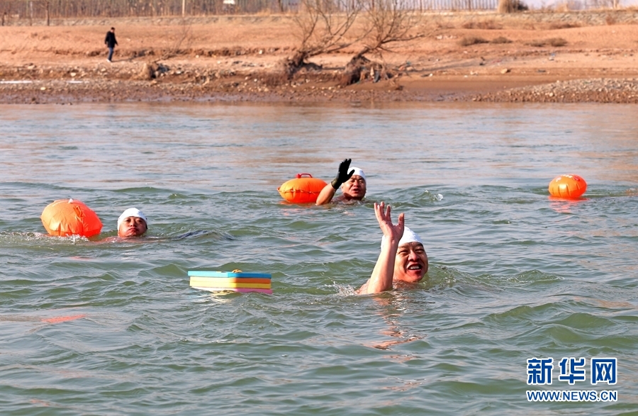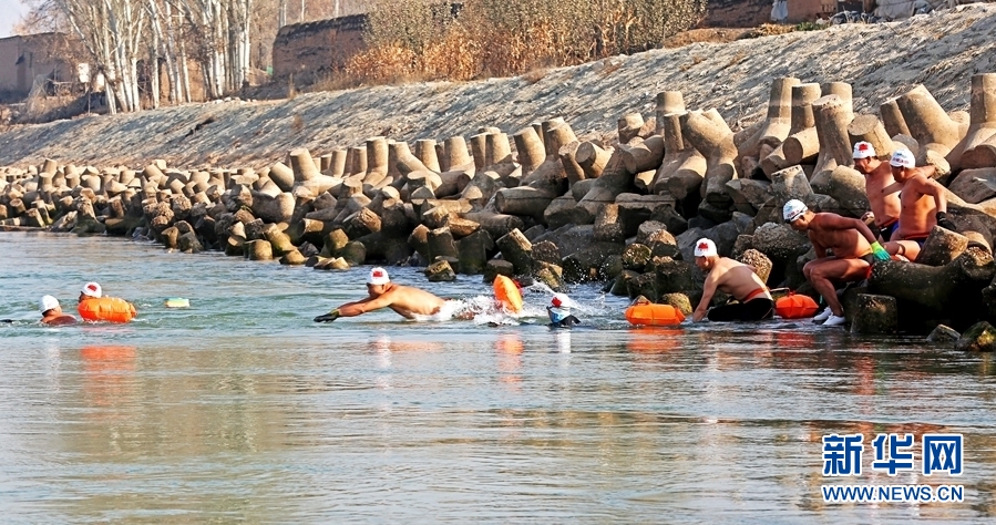 2022年元旦假期,甘肅省白銀市21名冬泳健將冒著嚴(yán)寒來到黃河白銀水川段,以漂流或橫渡的方式暢游黃河,歡慶新年。新華網(wǎng)發(fā)(熊江彬 攝)