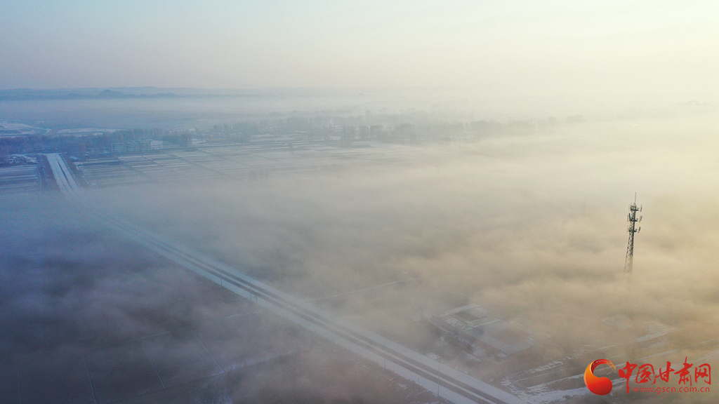 2月8日清晨,甘肅張掖市高臺(tái)縣黑河國(guó)家城市濕地公園上空霧浪翻滾,虛無(wú)縹緲,恍如天宮仙境,呈現(xiàn)出海市蜃樓般的云海奇觀,在陽(yáng)光的照射下,格外美麗。由于多年來(lái)黑河生態(tài)治理,冬天封凍,加之近日大范圍的降雪低溫天氣,黑河的水面上經(jīng)常霧氣蒸騰,兩岸的樹木玉樹瓊花,形成霧凇景觀,如同童話世界里的仙境一般圣潔,令人心曠神怡。